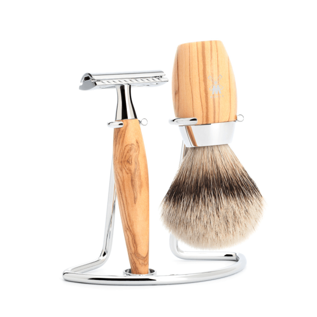 Set de rasage, blaireau pur argenté et rasoir de sûreté, bois d’olivier – Mühle Kosmo